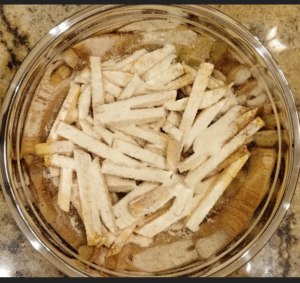 The unflavored whey protein is used to lightly coat the fries and is the ingredient that gives the rutabaga fries its crispiness